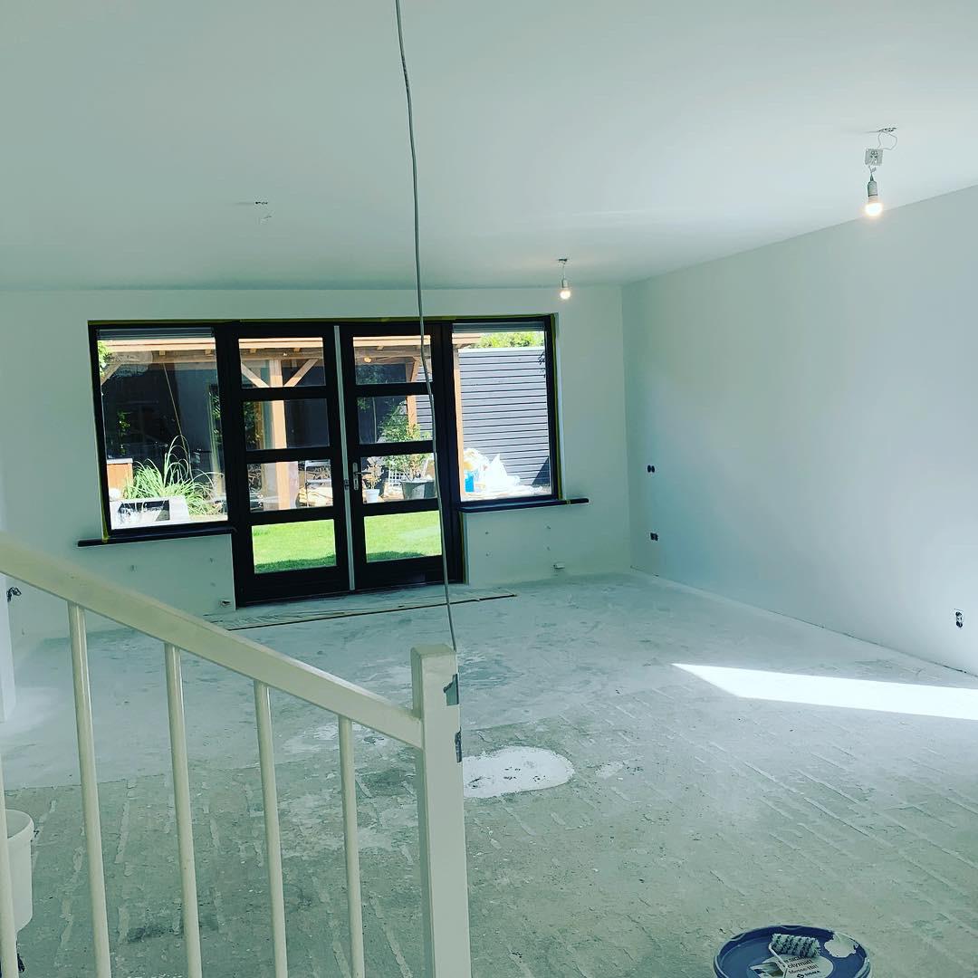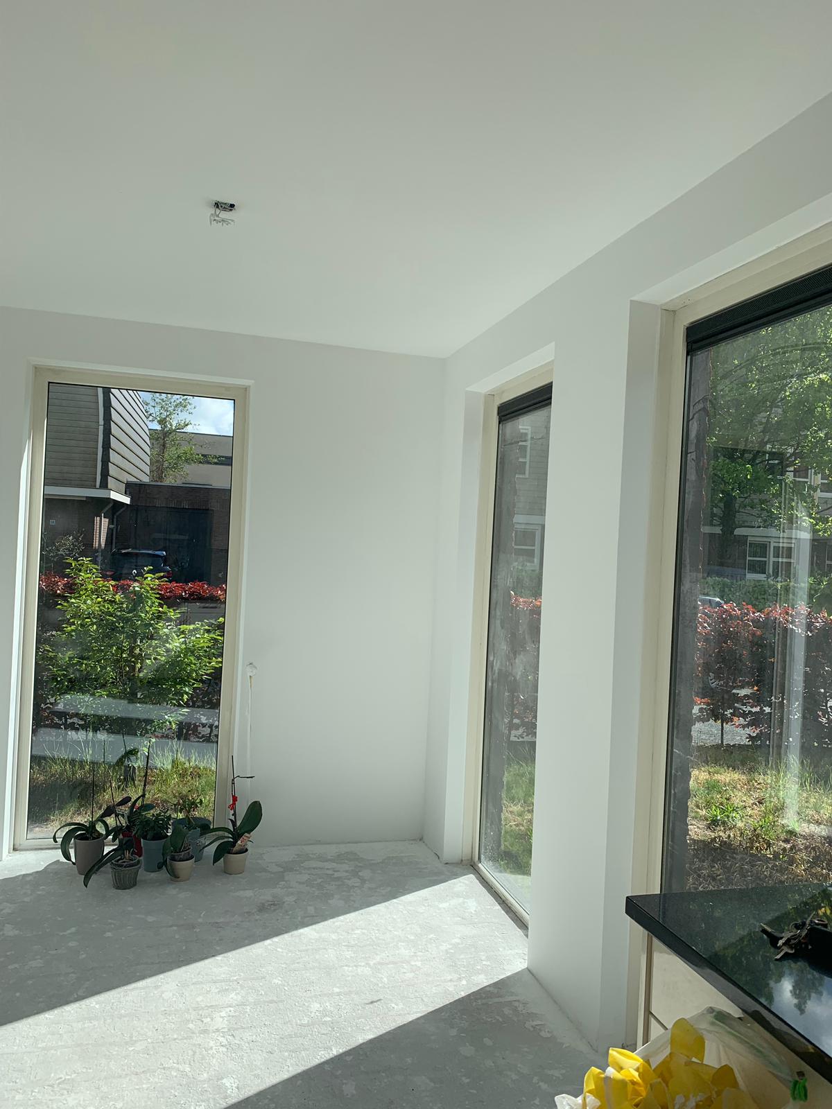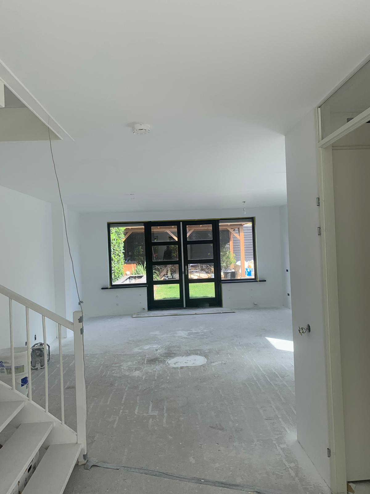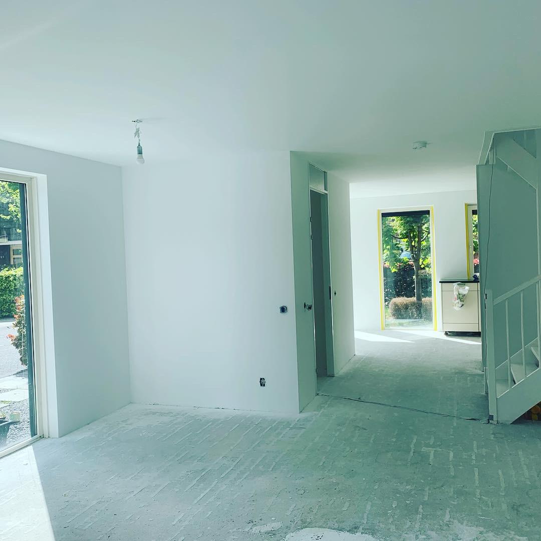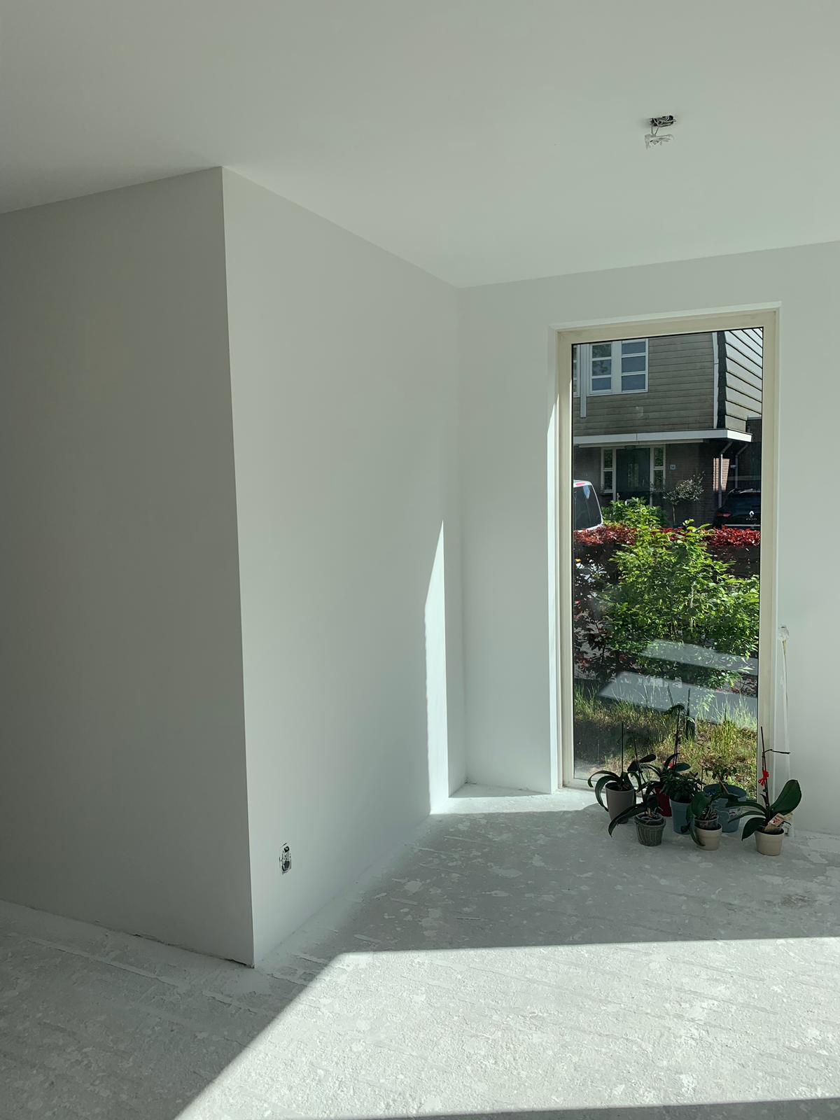Deze woonkamer in Amersfoort Vathorst is mooi gespoten in de sigma latex wit nadat we de woonkamer gestukadoord hebben.